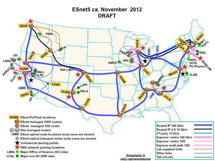 In mid-July we began activating the 100 gigabit-per-second optical waves needed to deploy the new nationwide ESnet5 backbone into production by the end of November. We are thrilled to announce that all of the waves have been brought up successfully as of October 23. In parallel with this work, ESnet engineers have successfully tested the new network using a clever “snake test” wherein a path is provisioned through the entire network and traffic is generated and received by test equipment, looking for errors and packet loss. The details of this test will be described in a separate blog, so stay tuned.